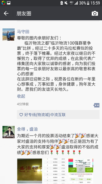 2017年12月4日,在为我园区华中物流投票时发现,我物流公司也在“群星争霸”的赛事中,票数为一千多票,排在第12名,当时非常激动,董事长马守田亲自组织,副总主持,召开广缘物流专线经理和各部门会议,专题研究利用此次赛事,把广缘物流积累的二十余年的能量发挥出来,把客户群体对广缘的信赖感调动起来,同时召开各分公司视频会议,让收货人对广缘物流做更加全面的评价。
